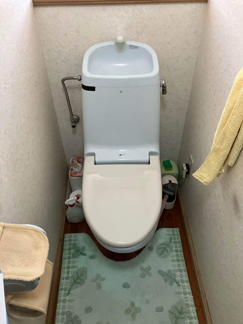 トイレが古くなり、特に便器のフチの裏側など水アカや黄ばみが取れにくく、毎日の清掃に非常に手間がかかるのがお悩みでした。また、古いタイプのため水の量が多く、水道代も気になっていたとのこと。とにかく清掃が楽で、節水できる清潔感のあるトイレに交換したいというご要望でした。