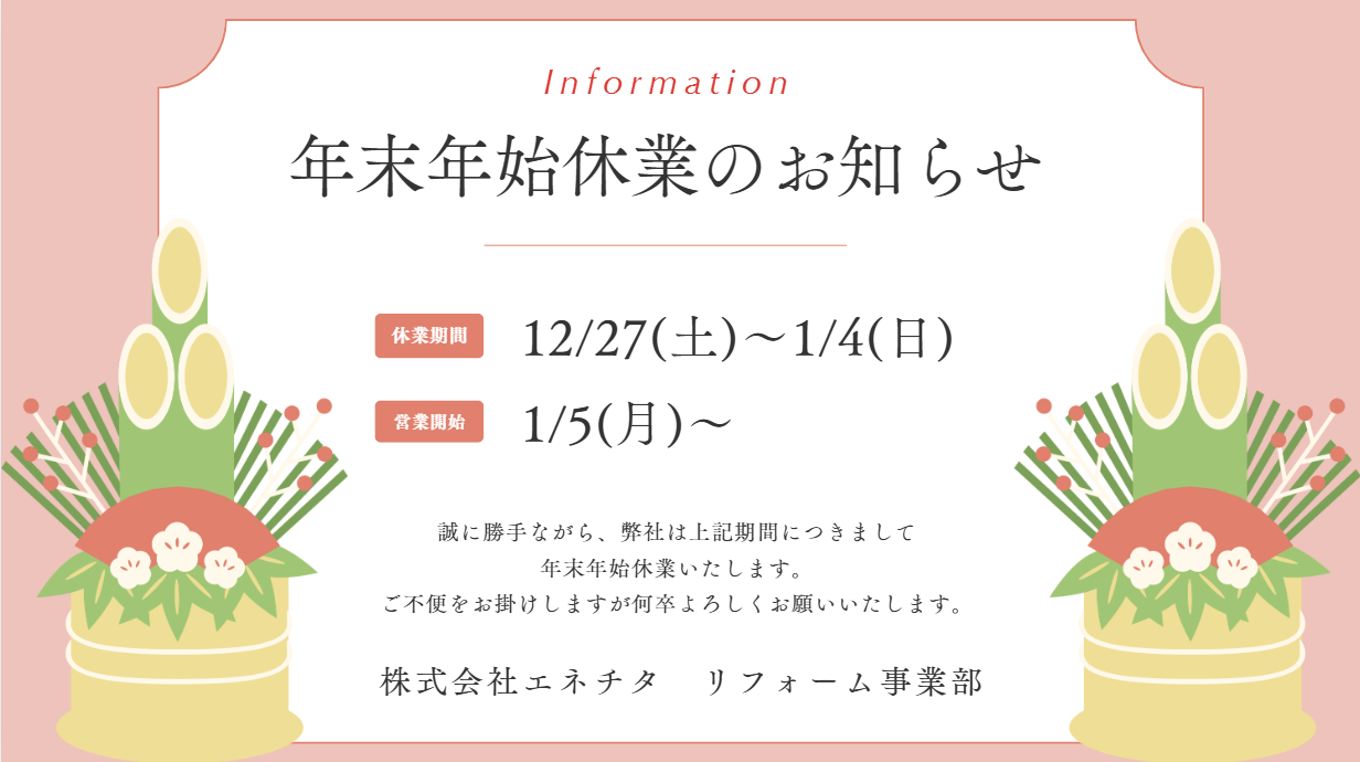 お知らせ 年末・年始の営業について 平素は格別のご高配を賜り、厚くお礼申し上げます。 株式会社エネチタ リフォームショールームでは、年末年始の休業日につきまして、下記のとおり休業日とさせていただきます。 皆様には大変ご迷惑をおかけしますが、ご了承いただきますようお願い申し上げます。 ■お盆休業日 2025年12月27日(土)~2026年1月4日(日) ※2026年1月5日(月)より、通常営業を開始いたします。 お問い合わせにつきましては、2026年1月5日(月)以降ご連絡させていただきます。 株式会社エネチタ 従業員一同 前へ一覧を見る