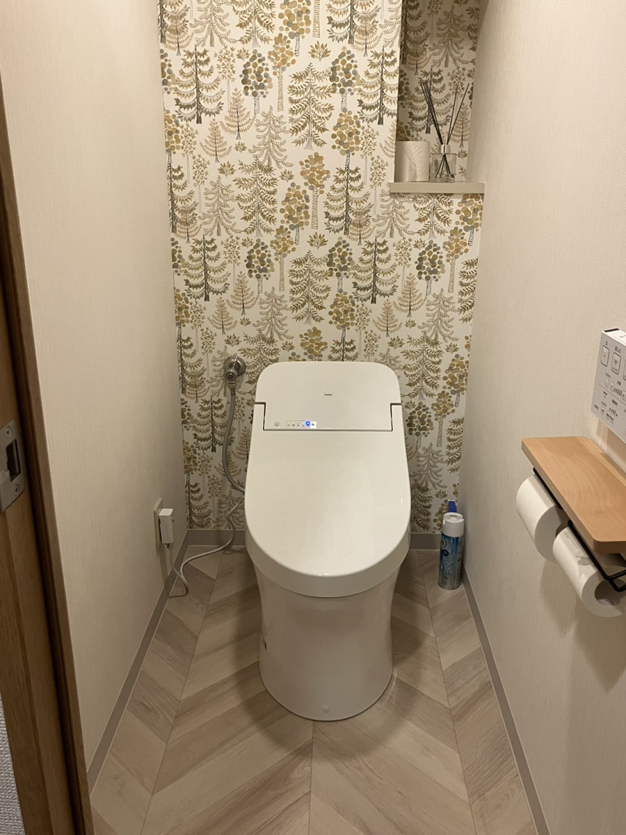 さらに、今回は内装工事も一緒にご提案させて頂き、内装にもこだわりたいとのご要望がございましたので、AA級と呼ばれるワンランク上のクロスを1面ご提案させていただきました!こちらのAA級のクロスはSP級に比べ、色や柄の種類が豊富なため、よりお客様の理想のトイレ空間にする事ができます!今回はお客様がどのような空間にしたいのかをお伺いし、唯一無二のトイレ空間を作り上げることができました!