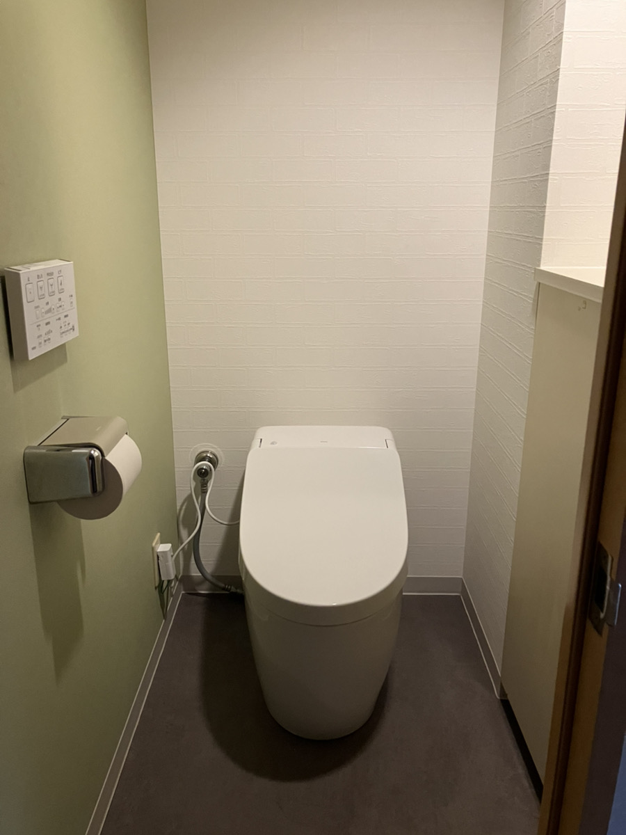 さらに、「部屋全体の雰囲気も変えたい」とのご要望もあったため、内装工事もご提案させていただきました!元々の壁のクロスは、全て同じ柄や色でしたが、今回は部屋の雰囲気をガラッと変えるためにも、サンゲツのSPシリーズから新しいクロスを選定させていただきました!こちらのクロスは非常に種類が豊富ありながら、クロスに厚みがあるため、下地の凹凸が目立ちにくく、「こんな内装にしたい!」をきれいにかなえてくれるシリーズとなっております!今回は、壁一面にアクセントカラーを入れ、ホテルのようなトイレ空間に生まれ変わりました!