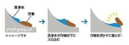 汚れがつアクアセラミックは水に馴染む性質(超親水性)があり、汚れの下に水が入り込んで浮かせて流すので、お掃除が劇的に楽になります。
