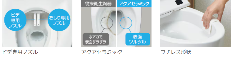 手の届きにくい便器奥をキャビネットで隠して、カンタンお掃除。日常のお掃除は、手の届きやすいカウンターまわりを拭くだけ。 床もお掃除モップでラクラクお掃除。