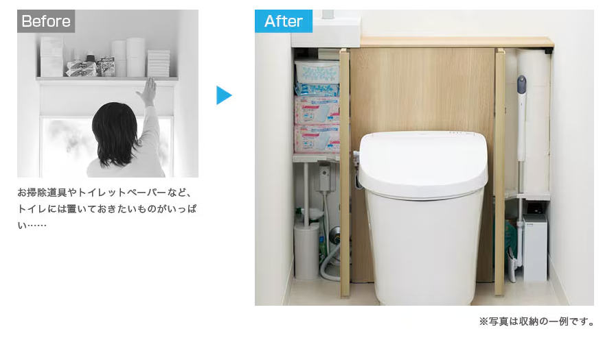 トイレに置いておきたいストックやお掃除道具などをキャビネット内にすっきり収納。 使いたいときにサッと取り出せます。 ※ 間口や止水栓の位置など条件によって収納量や収納できる位置は変わります。