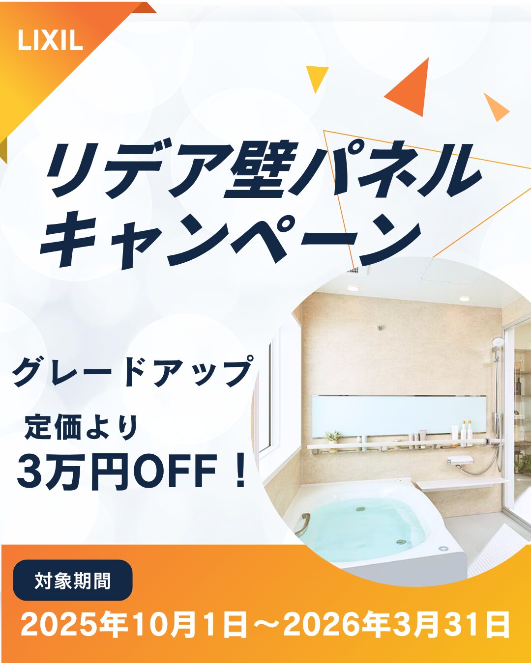 LIXILの人気バスルームシリーズ「リデア」にて、壁パネルのグレードアップが特別価格でご利用いただけるキャンペーンがスタートしました★